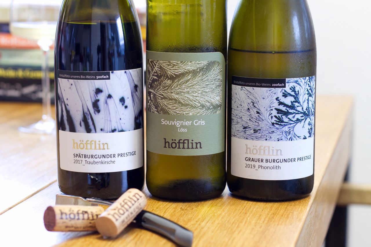 We drink a bottle of Souvignier Gris 2022, a bottle of Pinot Gris Phonolith 2019 and a bottle of Pinot Noir Traubenkirsche 2017 from the Höfflin winery in Baden.