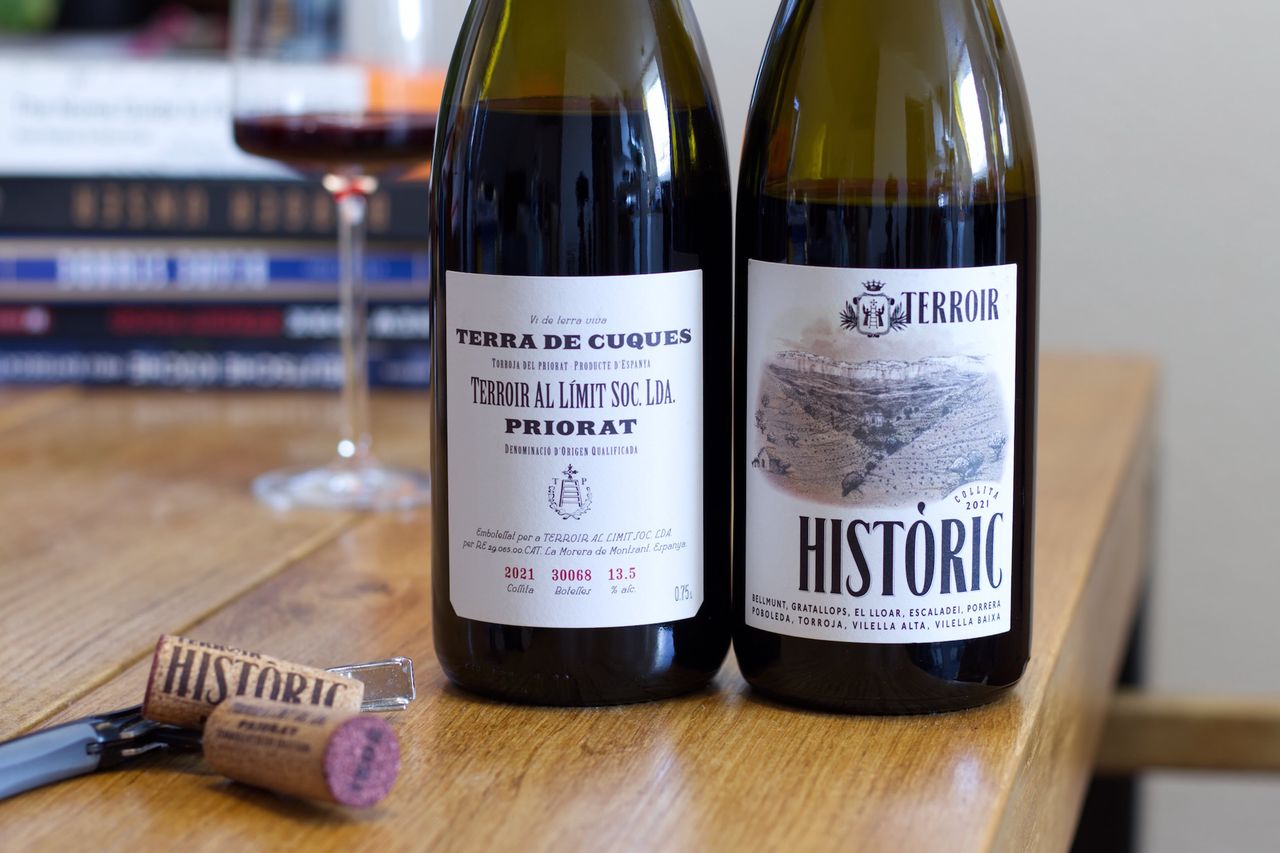 We drink from Priorat from the winery Terroir al Límit a bottle of Terroir Historic 2021 and a bottle of Terra de Cuques 2021.