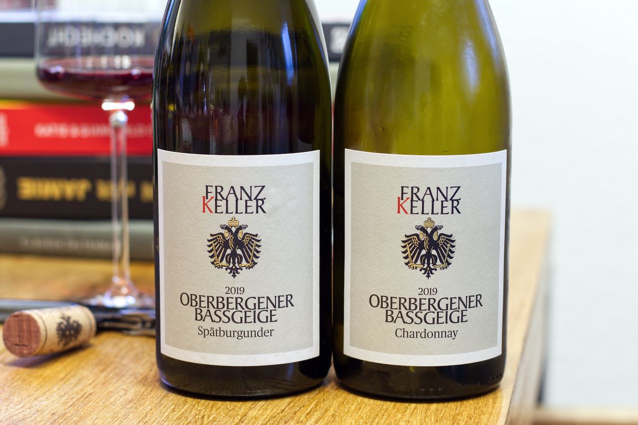 We drink from the Kaiserstuhl a bottle of Chardonnay and a bottle of Pinot Noir 2019 from the vineyard Oberbergener Bassgeige from the winery Franz Keller.