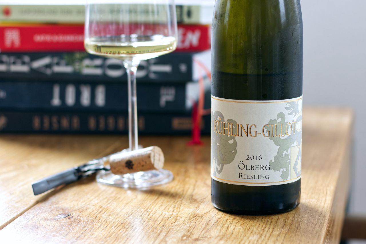 We drink a bottle of Riesling Ölberg Großes Gewächs from 2016 from the Kühling-Gillot winery.