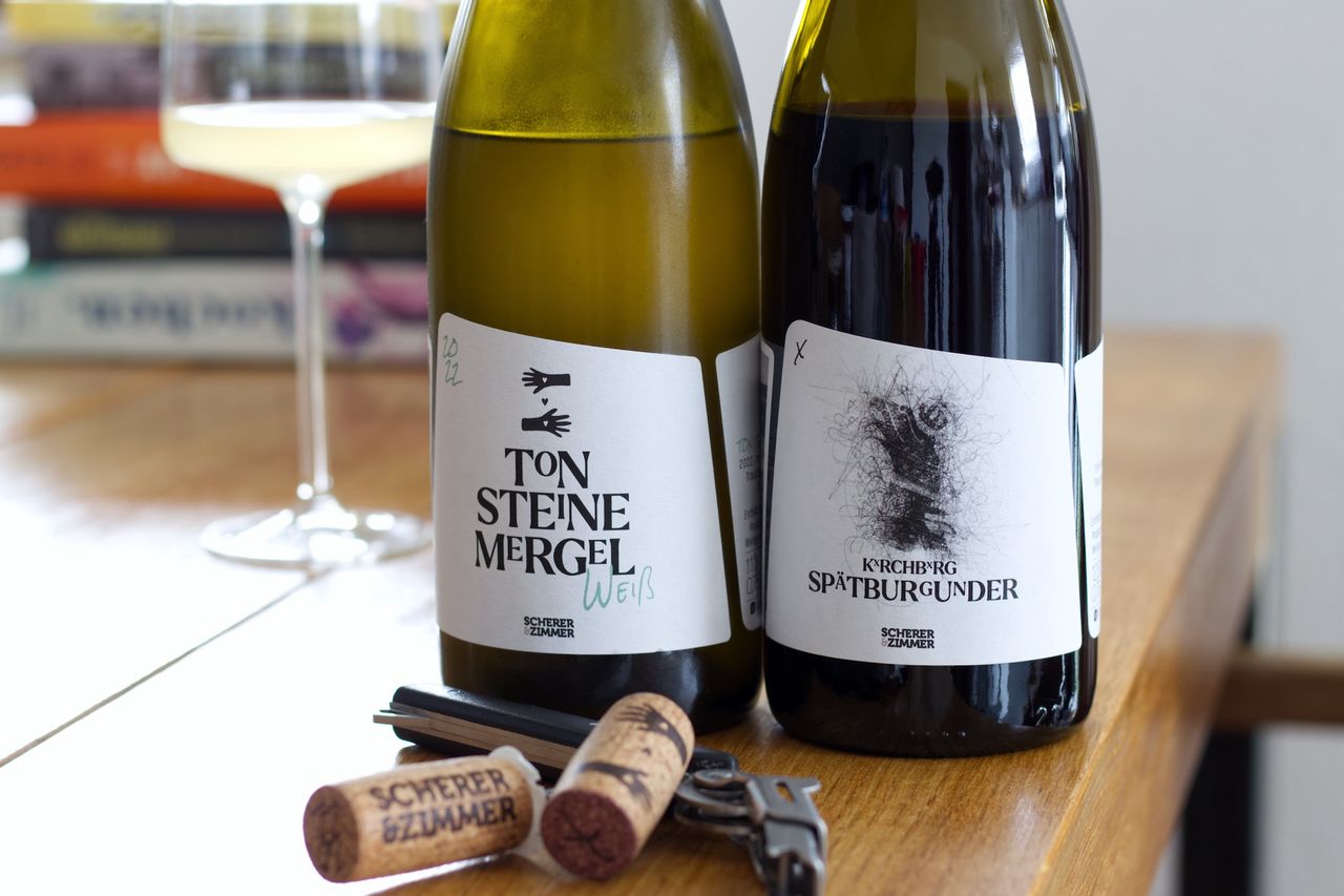 We're drinking a bottle of Ton Steine Mergel Weiß 2022 and a Pinot Noir Kxrchbxrg without a vintage from Scherer and Zimmer in Bad Krozingen.