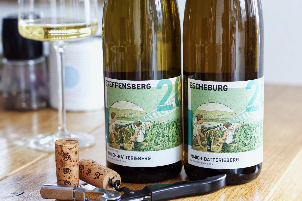 We drink the Rieslings Escheburg and Steffensberg made by the Immich-Batterieberg winery from Enkirch on the Moselle from the year 2017