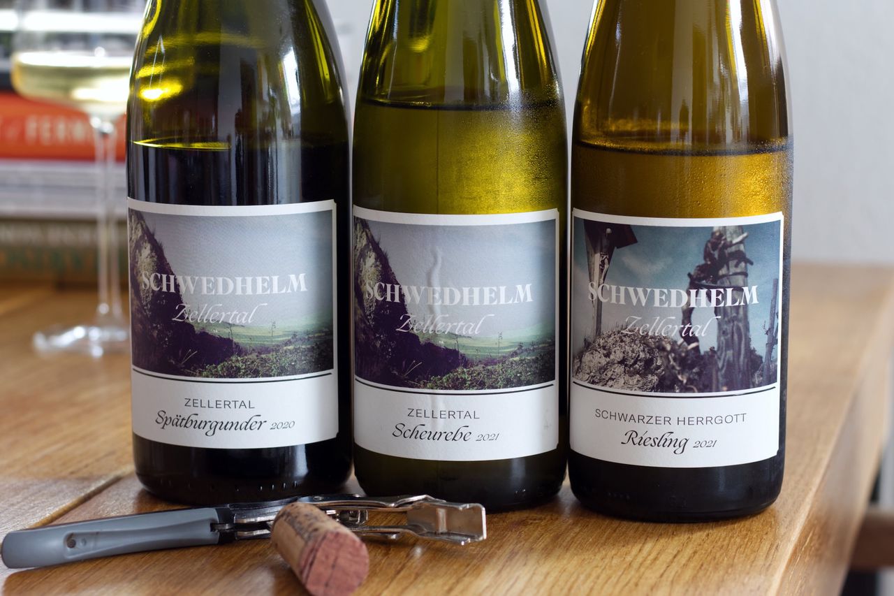 We drink a bottle of Zellertal Scheurebe 2021, a bottle of Riesling Schwarzer Herrgott 2021 and a bottle of Zellertal Spätburgunder 2020 from the Schwedhelm Winery in the Palatinate.