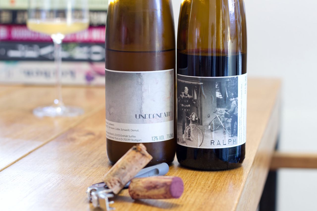 We are drinking a bottle of Underneath Riesling and a bottle of Ralph Pinot Noir, both from 2021, by Stephanie Türk, who produces tiny amounts of wine under the name Heslach Heights in Stuttgart.