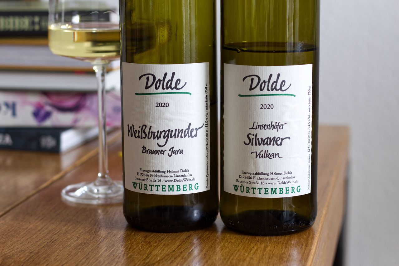 We drink brutally local from the winery Dolde a Silvaner Vulkan and a Weissburgunder Brauner Jura each from 2020.
